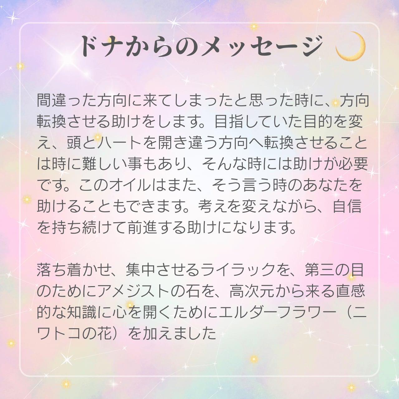 落ち着かせ、集中させるライラックを、第三の目のためにアメジストの石を、高次元から来る直感的な知識に心を開くためにエルダーフラワー(ニワトコの花)を加えました