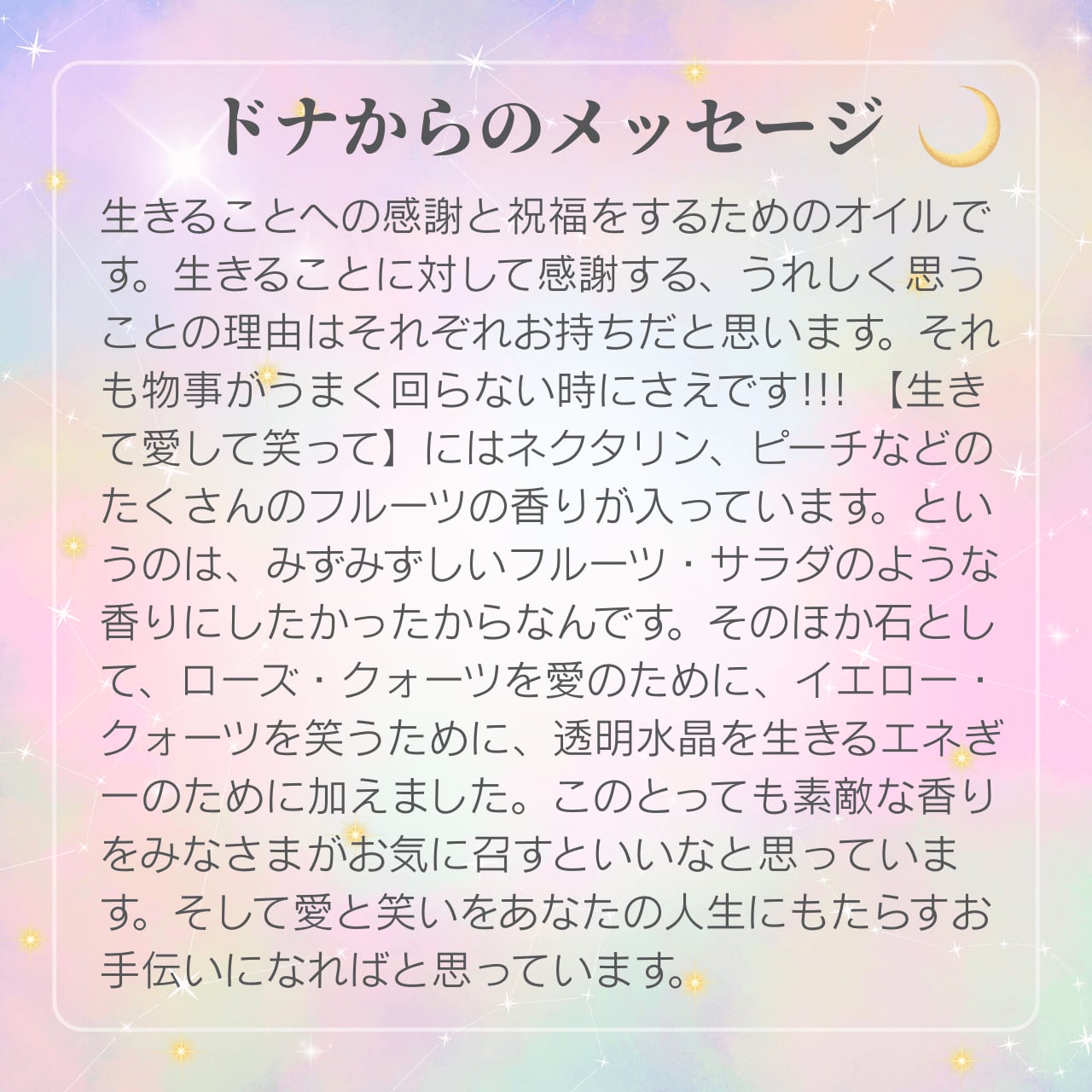 【生きて愛して笑って】にはネクタリン、ピーチなどのたくさんのフルーツの香りが入っています。というのは、みずみずしいフルーツ・サラダのような香りにしたかったからなんです。そのほか石として、ローズ・クォーツを愛のために、イエロー・クォーツを笑うために、透明水晶を生きるエネぎーのために加えました。