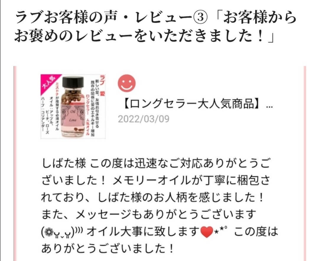 お客様の声①『このLOVEのメモリーオイルは本当に香りが良くて、人気があるのもうなづけます。』