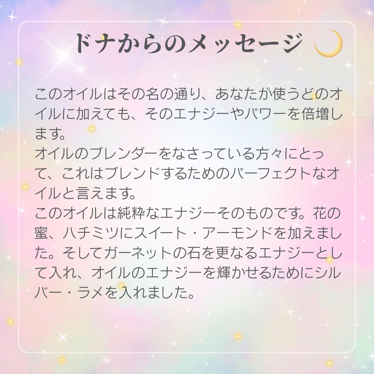 このオイルは純粋なエナジーそのものです。花の蜜、ハチミツにスイート・アーモンドを加えました。そしてガーネットの石を更なるエナジーとして入れ、オイルのエナジーを輝かせるためにシルバー・ラメを入れました。
