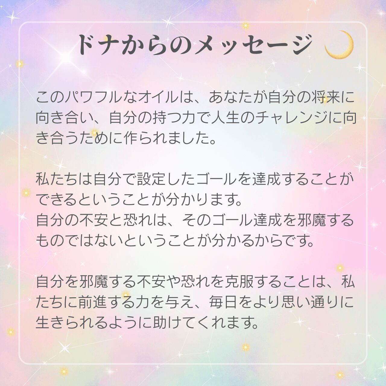 このパワフルなオイルは、あなたが自分の将来に向き合い、自分の持つ力で人生のチャレンジに向き合うために作られました。
