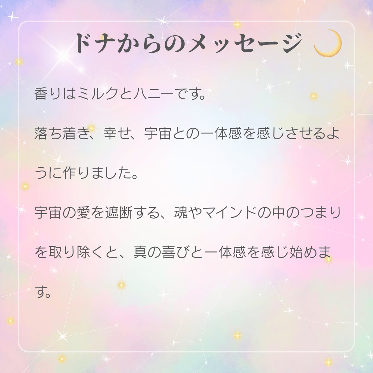香りはミルクとハニーです。落ち着き、幸せ、宇宙との一体感を感じさせるように作りました。宇宙の愛を遮断する、