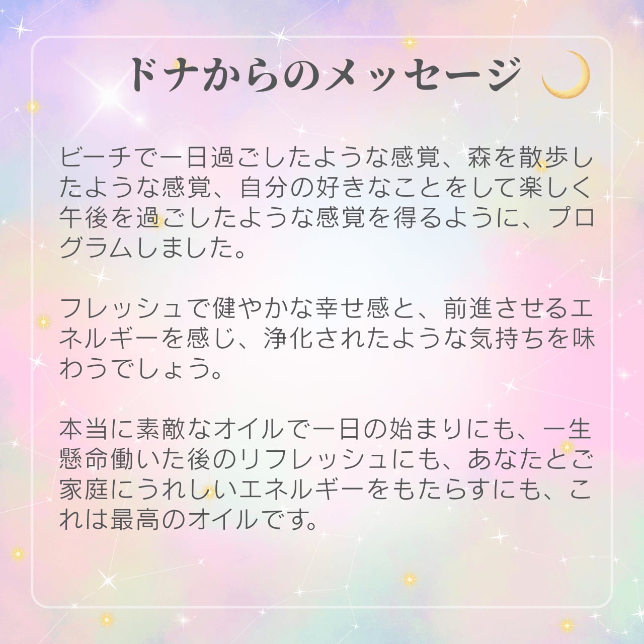本当に素敵なオイルで一日の始まりにも、一生懸命働いた後のリフレッシュにも、あなたとご家庭にうれしいエネルギーをもたらすにも、これは最高のオイルです。