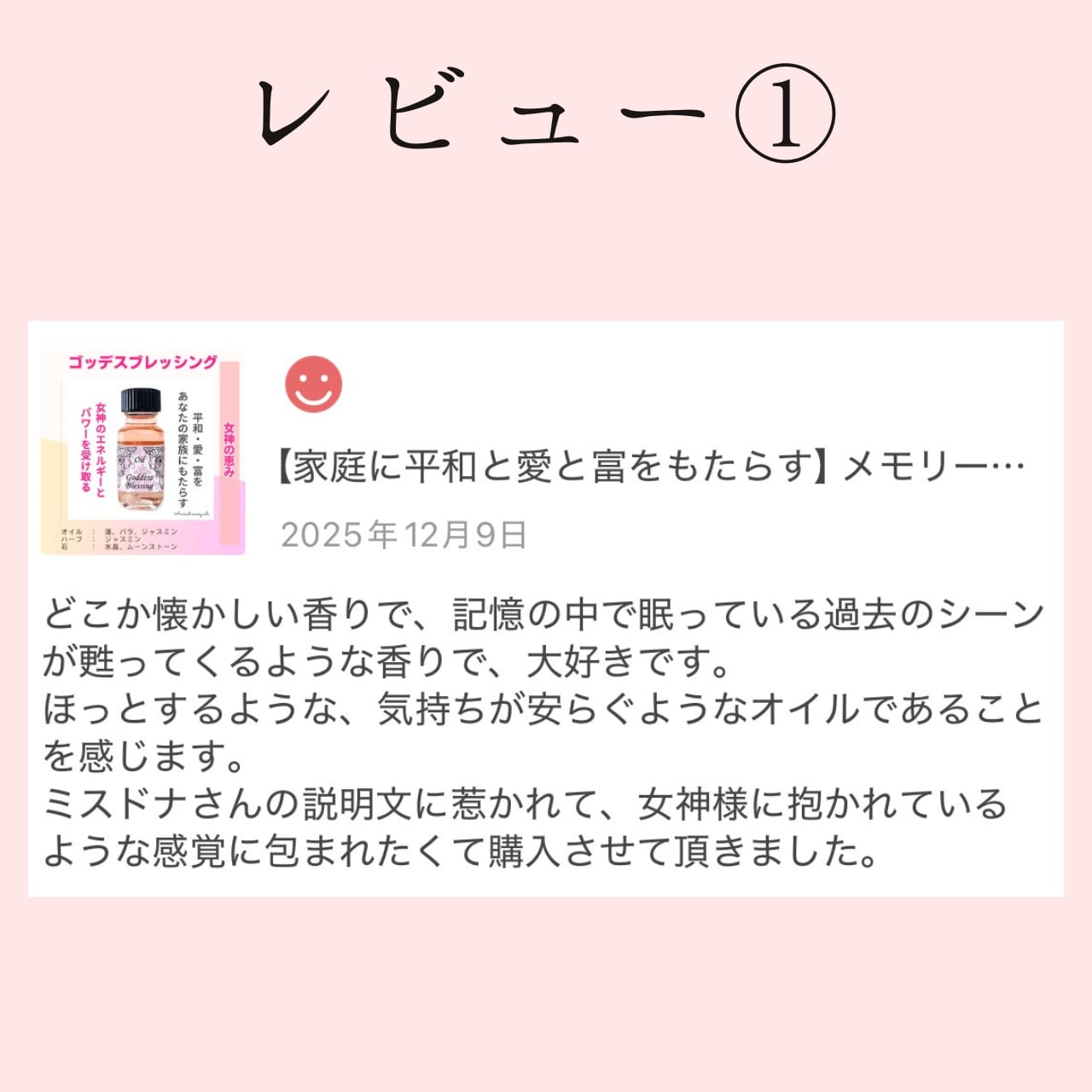 このオイルは女神の恵みをあなたに、大切な人に、ご家庭に、もたらすようプログラムしました。