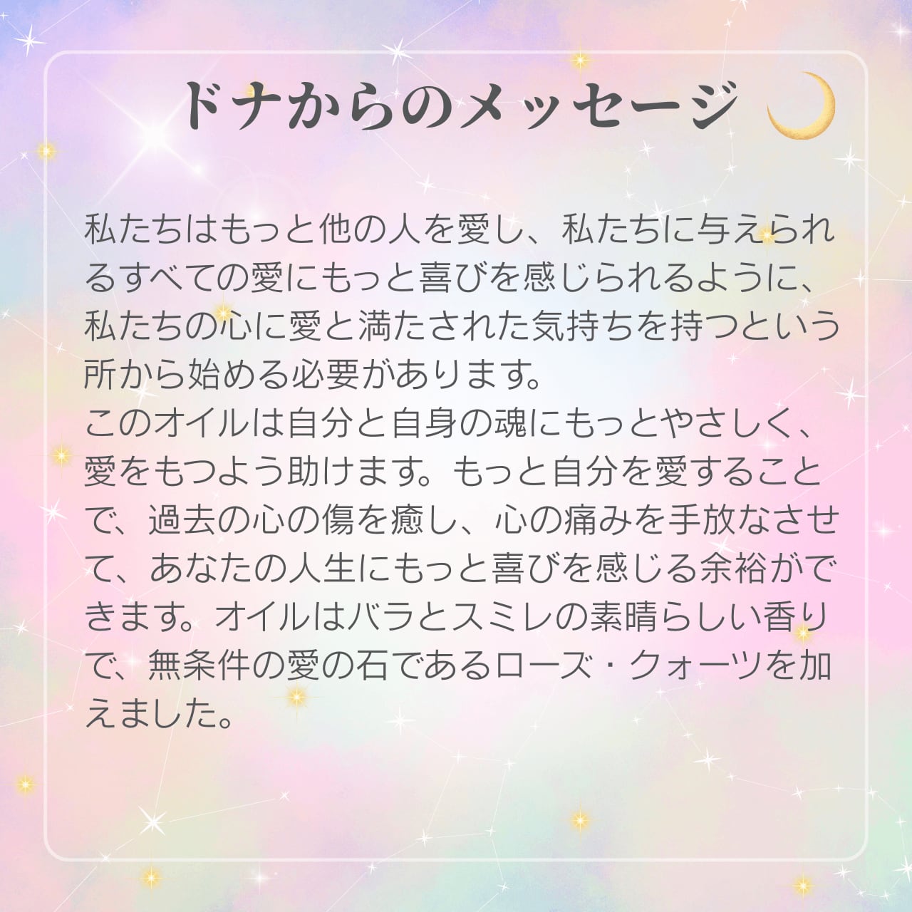 このオイルは自分と自身の魂にもっとやさしく、愛をもつよう助けます。もっと自分を愛することで、過去の心の傷を癒し、心の痛みを手放なさせて、あなたの人生にもっと喜びを感じる余裕ができます。